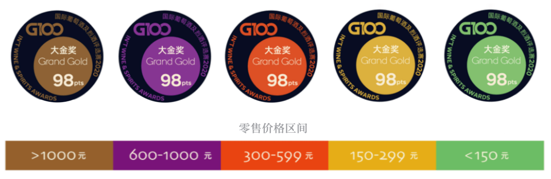 G100大赛奖标暗藏的最大“玄机”,便是上面标注的中国市场零售价。为保证评选公平性,G100大赛评选时会根据参赛酒款零售价进行相应的分组。具体的获奖酒款零售价标示通过不同颜色奖标体现:
