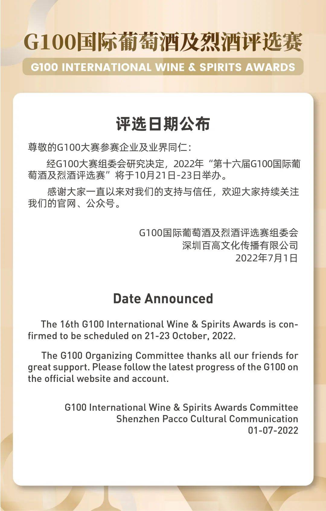 经G100大赛组委会研究决定,2022年“第十六届G100国际葡萄酒及烈酒评选赛”将于10月21日-23日举办。