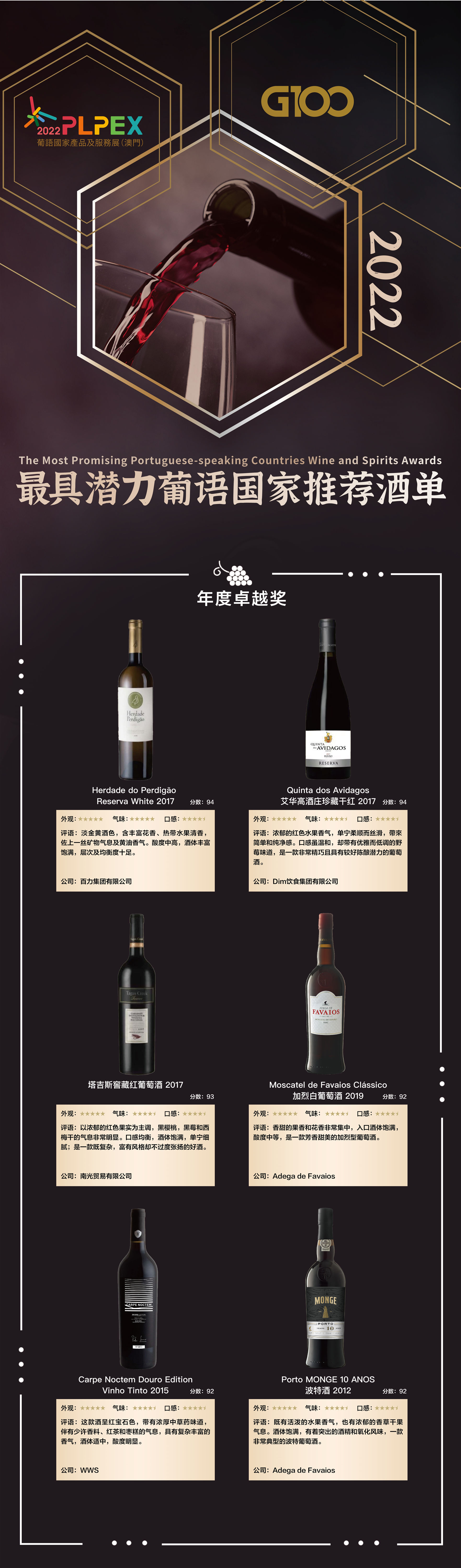 G100国际葡萄酒及烈酒评选赛首次联合2022年葡语国家产品及服务展(澳门)(2022PLPEX)推出“G100 X 2022PLPEX最具潜力葡语国家推荐酒单”,今日正式公布酒单结果。