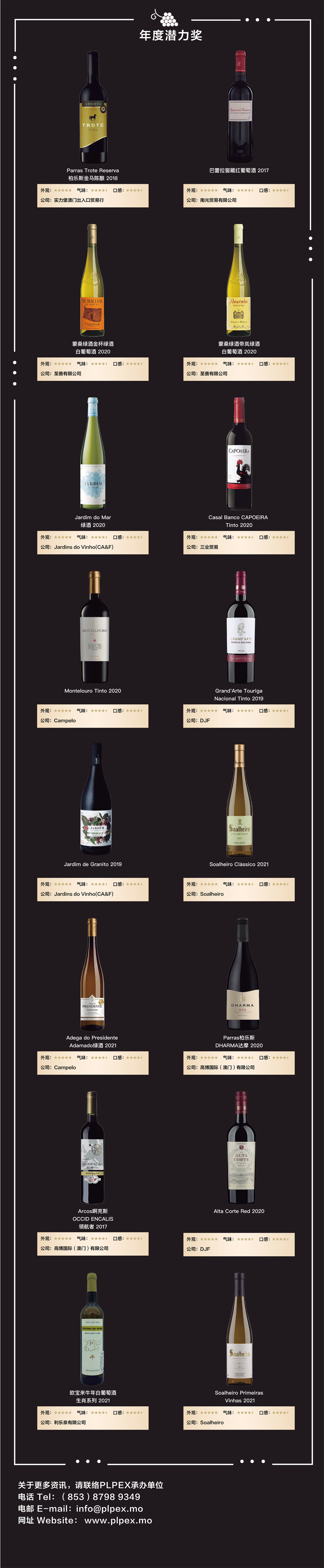 来自粤港澳大湾区的酒业、餐饮、教育、媒体、商超等行业的专业评委,甄选出34款优质葡语国家酒款,其中有6款获得“年度卓越奖”, 12款获得“年度臻选奖”以及16款获得“年度潜力奖”。